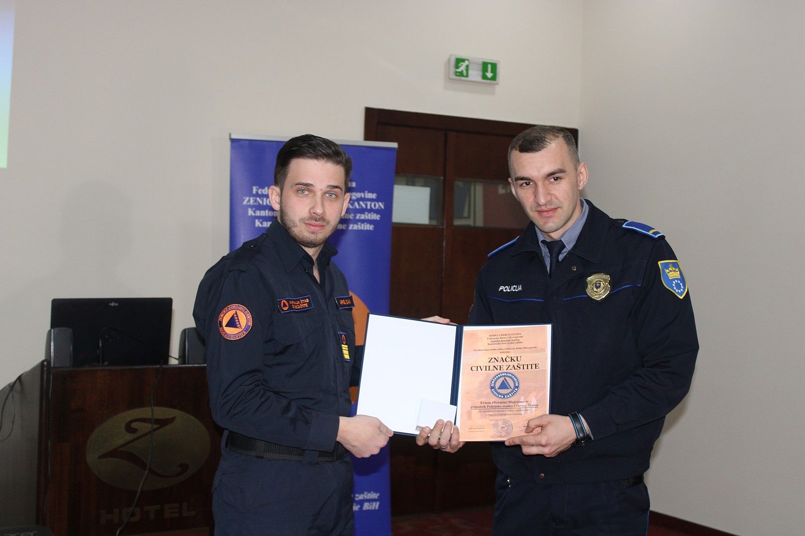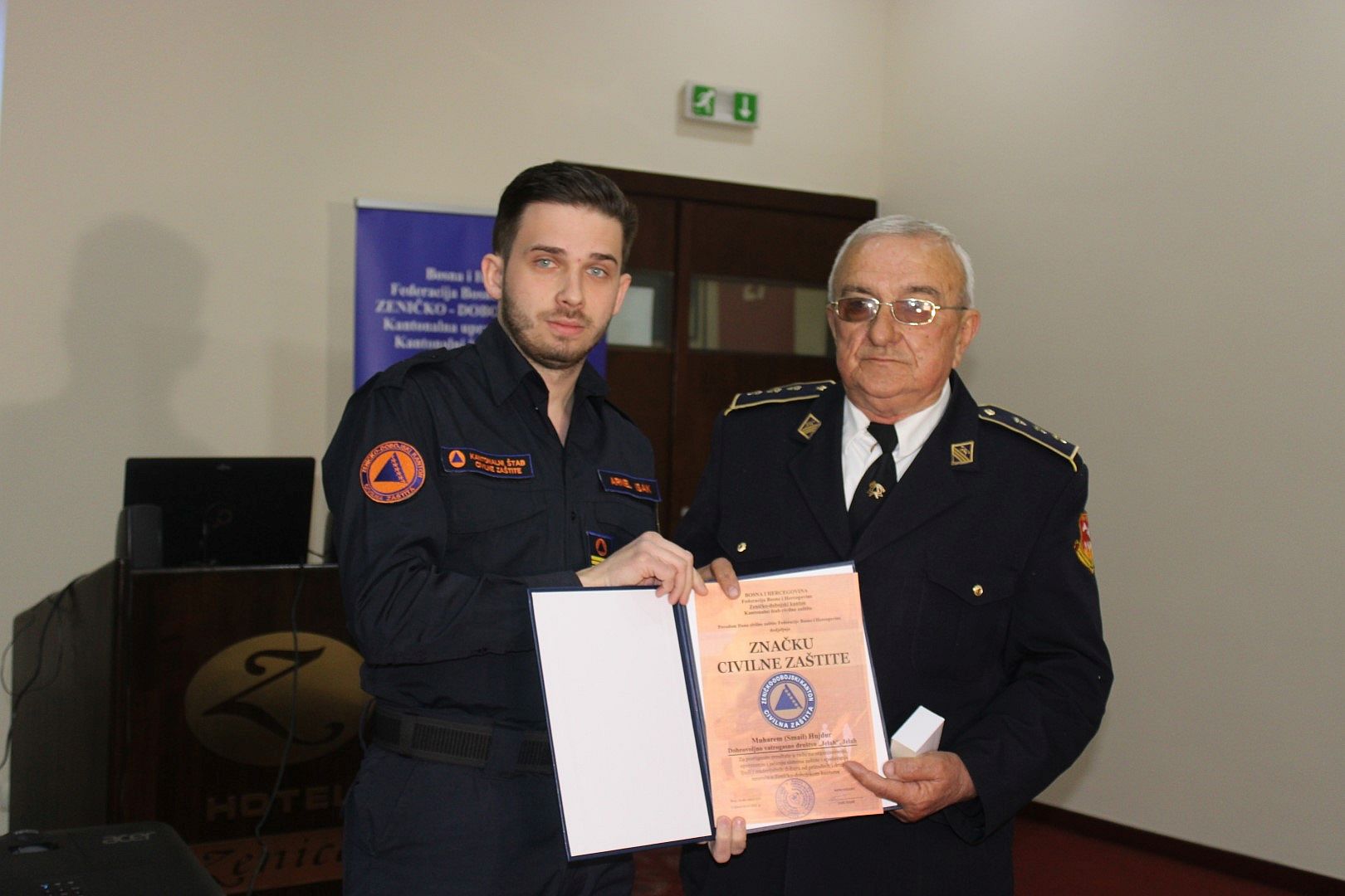 Komandant KŠCZ-a i ministar za prostorno uređenje, promet i komunikacije i zaštitu okoline Arnel Isak uručio je najviše prizannje "Zlatnu značku" Muharemu Hujduru iz Tešnja, članu Dobrovoljnog vatrogasnog društva Jelah, za izuzetan doprinos razvoju sistema zaštite i spašavanja od požara i uspostavljanje Vatrogasnog saveza Zeničko-dobojskog kantona, te Erminu Mujezinoviću, policajcu Policijske stanice Crkvice Zenica, koji je 20. marta 2021. godine spasio trogodišnjeg dječaka od utapanja u rijeci Bosni.